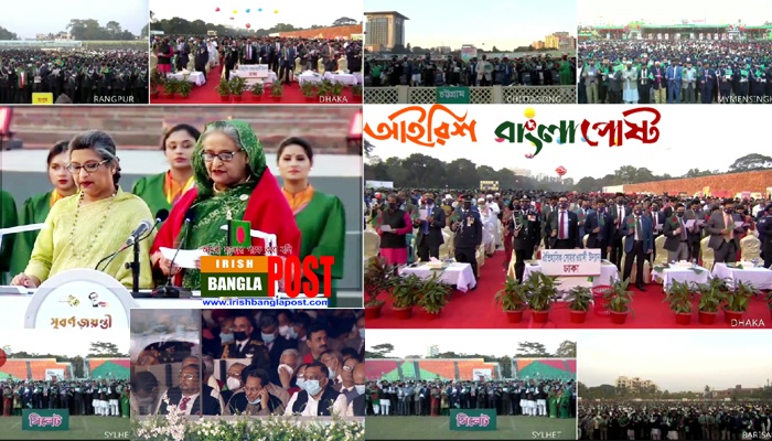 আইরিশ বাংলাপোষ্ট ডেস্কঃ গৌরবোজ্জ্বল বিজয়ের ৫০ বছরে পা রেখেছে বাংলাদেশ। ১৯৭১ সালের এদিন মুক্তিকামী জনতার কাছে ঢাকার রেসকোর্স ময়দানে আত্মসমর্পণ করে পাকিস্তানি হানাদার বাহিনী। ইতিহাসের এই দিনেই দুই পক্ষ বসে বাঙালির বিজয়ের দলিলে সই করে। সেই দিনটির ৫০ বছর পূর্তি উপলক্ষে আজ বৃহস্পতিবার (১৬ ডিসেম্বর) আয়োজিত হলো সমাপনী অনুষ্ঠান। অনুষ্ঠানে দেশবাসীকে শপথবাক্য পাঠ করান প্রধানমন্ত্রী শেখ হাসিনা। তার সঙ্গে দেশবাসীও শপথবাক্য দৃপ্ত কণ্ঠে উচ্চারণ করেন। প্রধানমন্ত্রীর সঙ্গে এ সময় মঞ্চে ছিলেন তার ছোটবোন শেখ রেহানা।