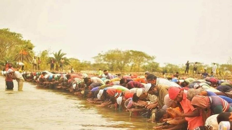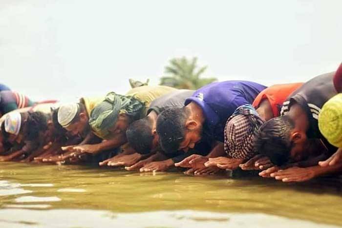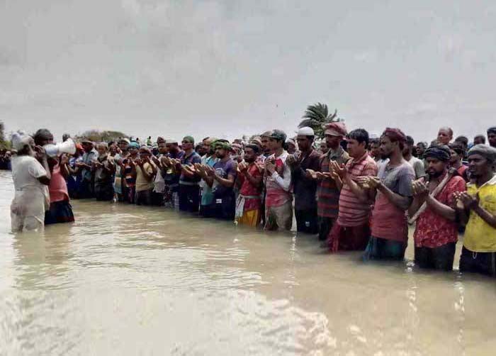 ঘূর্ণিঝড় আম্পানে ক্ষতিগ্রস্ত বাংলাদেশের উপকূলীয় জেলা খুলনার কয়রা উপজেলায় ক্ষতিগ্রস্ত বাঁধ নিমাণের কাজে অংশ নিতে আসা শ্রমিক ও গ্রামবাসী বন্যাপ্লাবিত মাঠে পানিতে দাঁড়িয়েই ঈদুল ফিতরের নামাজ আদায় করেছে।
